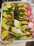 Full tray taco mixtos (35 tacos) pollo, carnitas, bistec, 1/2 tray chicken wings, plain, BBQ or Buffalo, 2 Large plain pizza & 2 Liter soda.